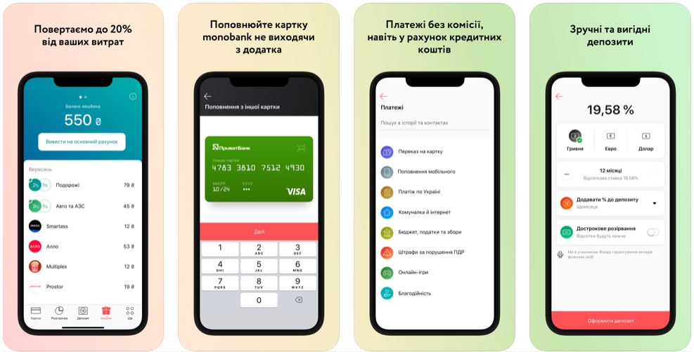 Monobank allows users to make payments, free replenishment, installment purchase, cashback up to 20%, and expense & currency accounting online.