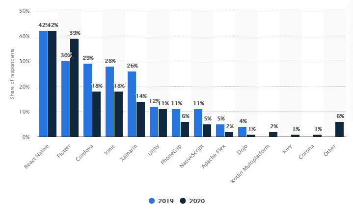 According to a recent survey of Statista, more than 42% of the mobile applications are based on React Native, which makes it the most popular smartphone application making platform. React Native is also known as a multi-platform development solution, as one can develop applications for both Android and iOS platforms using this platform.