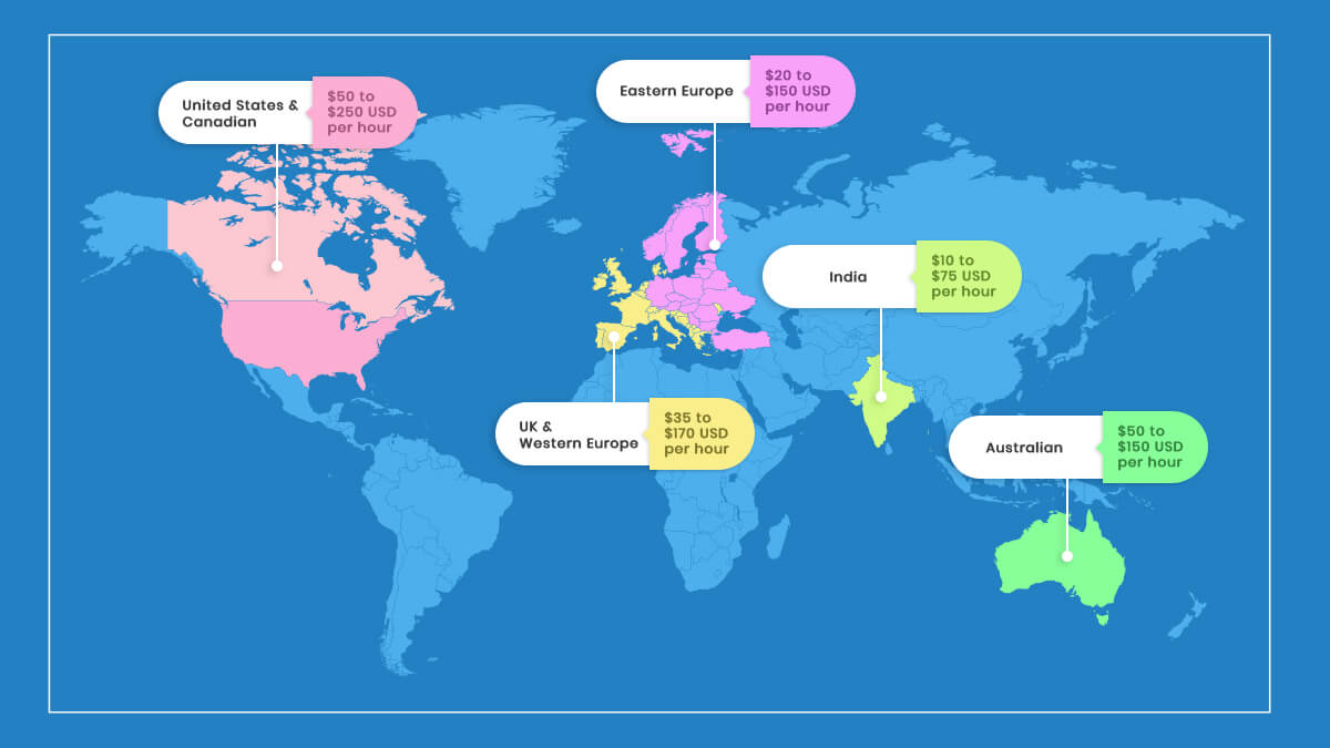 North America, for example, is the costliest region to hire mobile app developers from. Their hourly rate ranges from $50 USD to $250 USD.