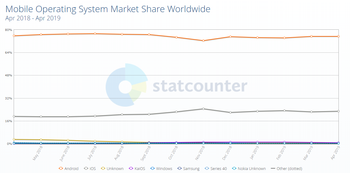 According to Statcounter, Android was leading the mobile app market with 74.85% share while iOS held the second position with 22.94 % until April 2019.